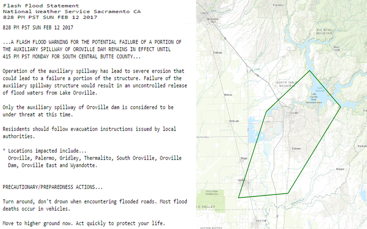 8:40pm: Flash flood warning remains in effect. Only the auxiliary spillway of #OrovilleDam is considered to be under threat at this time.